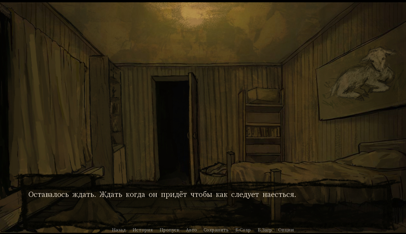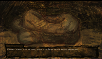 но это лишь один из способов привязать нас к истории, сделать ее частью более простым способом через визуальные образы. по настоящему проникаешься прозой, слогом автора, то как НАСКОЛЬКО точно описываются физические недуги, что ты взаправду начинаешь морщится от ощущения слоя кожи на теле и наличию органов. автор говорит через текст, сближается с игроком, дает ему возможность ощущать себя в другой шкуре, самому оказаться в безысходном положении когда все твое естество состоит в примитивных потребностях и содержание собственной туши. а отдельное занятие трактовка метафор и аллегорий, додумывания своего и поиск собственного смысла...в общем, автор для меня раскрылся в первую очередь как сценарист и писатель!!! я перепроходила раз десять, фиксанулась на этом и сама написала несколько стихов на этой почве... действительно тот уровень, к которому хотелось бы стремиться ну и в довершение - музыкальное сопровождение. оно простое, но вместе с тем гнетущее, идеально вписывающиеся к общей атмосфере. музыка не перетягивает на себя одеяло, однако же прекрасно держит до конца в тисках и накаляет саспенс я не очень хороша в изложении своих мыслей в качестве отзыва, ибо опускаюсь до хвалебных возгласов, но у меня правда такое впечатление... с учетом того, что это ПЕРВАЯ ИГРА, полностью сделанная одним человеком, с его концептами и сюжетом, у меня просто слов нет!! хотелось бы увидеть дальнейшие проекты, с более разнообразными геймплейными фишками (например, рпг...кто знает??) и более длительным хронометражом. искренне буду болеть за автора ^_^